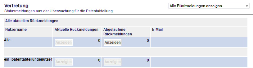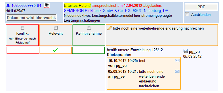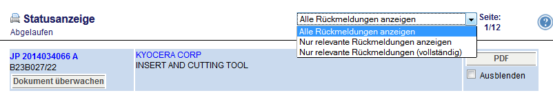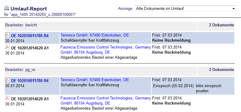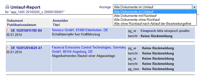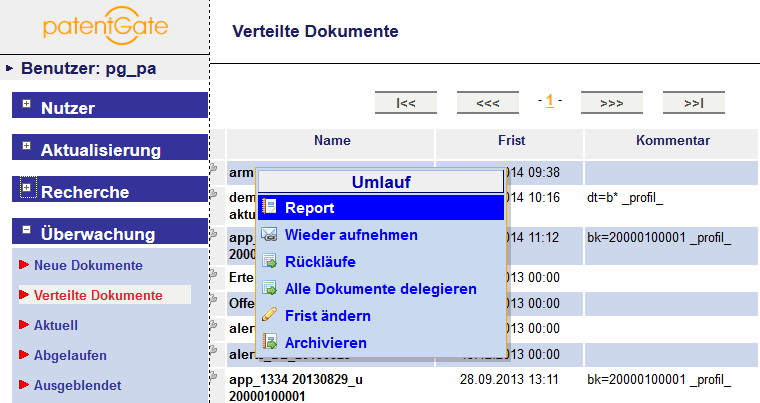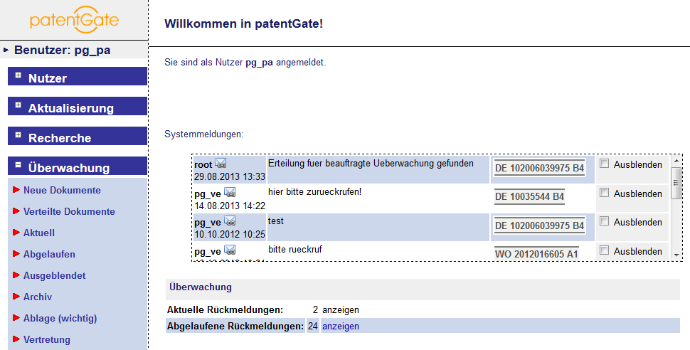 Die Rückläufe aus dem Patentumlauf werden nach dem Login angezeigt. Sie sind auch im Navigationsmenü unter "Überwachung" zu erreichen. Dabei enthält der Menüpunkt "Aktuell" alle nicht ausgeblendeten Rückläufe, zu denen die Bearbeitungsfrist des Umlaufs noch nicht abgelaufen ist, "Abgelaufen" alle nicht ausgeblendeten, deren Bearbeitungsfrist abgelaufen ist, "Ausgeblendet" die ausgeblendeten Dokumente sowie "Wichtig" alle Dokumente, die vom Bearbeiter in der Patentabteilung als "Einspruch" / "Wichtig" bewertet wurden.